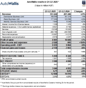 Evaluating the results of the first nine months, Gábor Ormosy, CEO of AutoWallis Group, said that the over 20% revenue growth was driven by both organic and acquisition effects. While gross margin generation remained broadly in line with previous levels, AutoWallis delivered lower EBITDA, profit before tax, and net profit than last year, which is consistent with management expectations. At the same time, this does not affect the feasibility of the Group’s previously defined strategic objectives and continues to provide a stable basis for the company’s growth strategy going forward.