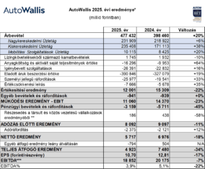 Ormosy Gábor, az AutoWallis Csoport vezérigazgatója a 2025-ös év eredményét értékelve elmondta, hogy a régió 17 országában már 30 márkát képviselő AutoWallis 2025-ös teljesítményét az organikus növekedés mellett a 2024-ben lezárt akvizíciók és a tavalyi üzletfejlesztések jelentős mértékben támogatták. Az árbevétel 20 százalékos emelkedése azt mutatja, hogy a társaság trendszerűen növekszik: a vállalat diverzifikált ország-, márka- és tevékenység-portfoliója hatékonyan működik, az AutoWallis változékony gazdasági környezetben, a képviselt márkák ciklikus teljesítménye ellenére is stabilan bővül. Az AutoWallis a korábbiakhoz hasonló mértékű bruttó árréstermelés mellett az újonnan elindított, felfutó márkák hatása miatt a tavalyihoz képest alacsonyabb EBITDA és adózás előtti, illetve nettó eredményt ért el, ugyanakkor mindez nem befolyásolja a korábban kitűzött stratégiai célok megvalósíthatóságát, és továbbra is stabil alapot ad a növekedési stratégia folytatására.